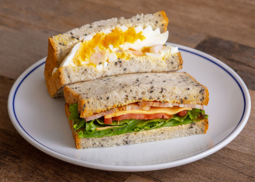 黒ごまの香ばしい風味が広がる、しっとりふわふわ食感のエスプレッソアメリカーノ特製食パンを使用したサンドイッチメニューです。